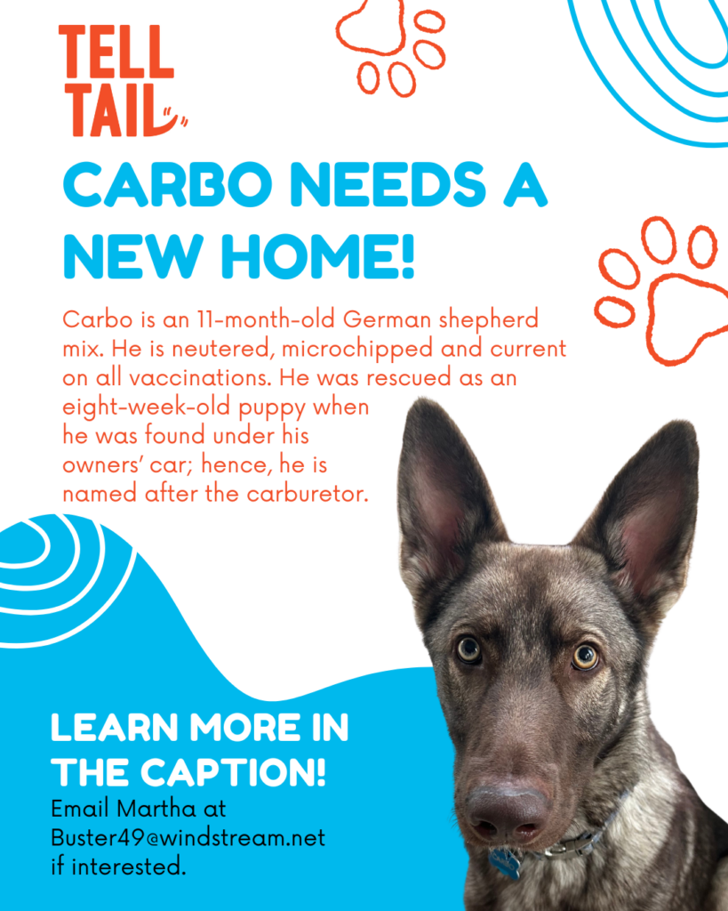 Carbo is an 11-month-old German shepherd mix. He is neutered, microchipped and current on all vaccinations. He was rescued as an eight-week-old puppy when he was found under his owners’ car; hence, he is named after the carburetor. He loves people, stuffed toys, and, especially, challenging toys. He is very smart and learns new commands quickly. He needs an owner who has the energy to match his and a willingness to train him. He is an outdoor /indoor dog who loves to be close to his owners. He sleeps inside. He eats salmon-based dog food and loves treats. He is not kennel-trained. He has not been around very small children or cats. He currently weighs 60 lbs. He plays well with other dogs when boarded but the owners have a smaller older female dog and they are not compatible. The owners are having health issues and are having to move to a house with a small yard. Carbo is a handsome, loving pup who needs a chance to be a great dog in the right environment.